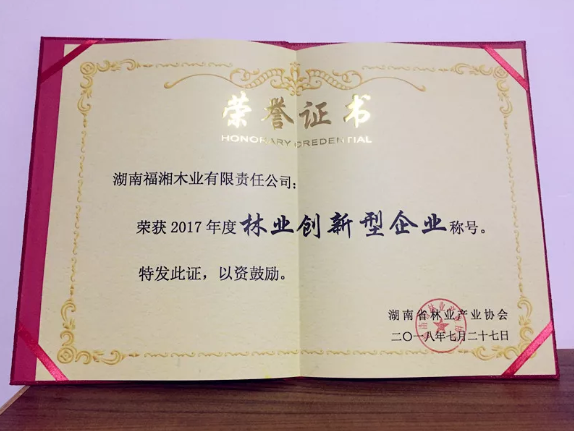 2018年8月,福湘木业荣获2017年度林业创新型企业称号