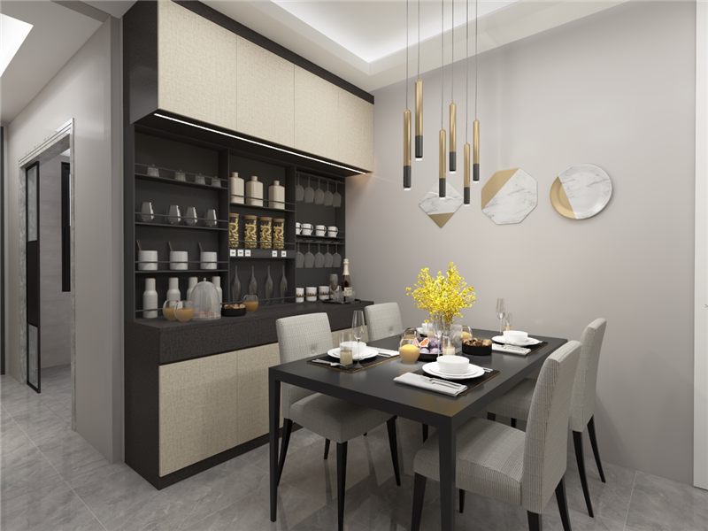 在餐桌的侧墙面做出物品收纳柜或是收纳架都能够达到方便取胜的效果,多余的空间也利用装饰起来,既美观又实用。